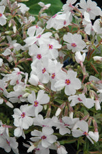 Amazing Grace Moss Phlox is smothered in stunning white star-shaped flowers with gold eyes and a hot pink ring at the ends of the stems from mid to late spring. Its tiny needle-like leaves remain forest green in color throughout the year.