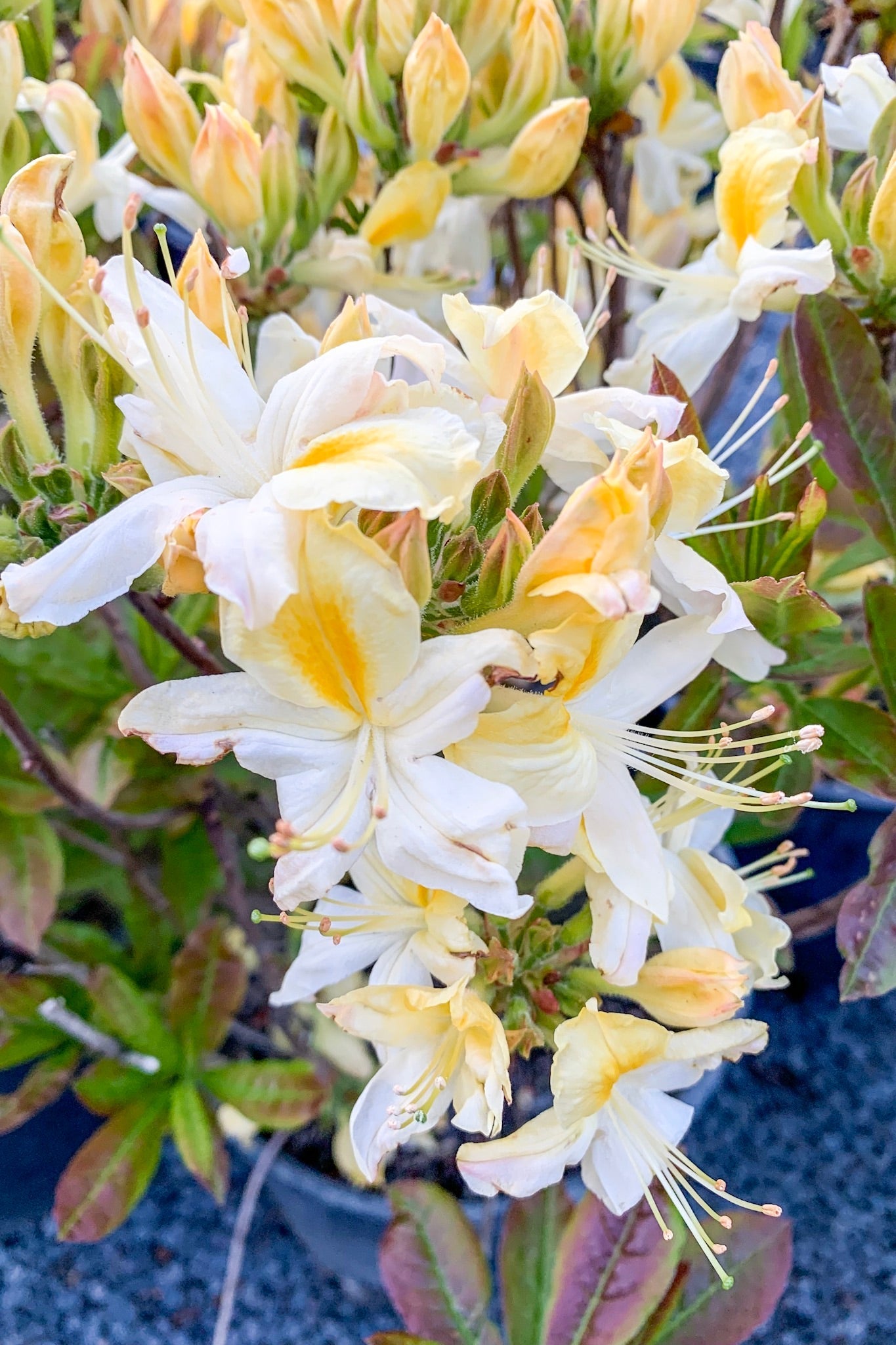 Unit price perExceptionally hardy deciduous azalea featuring lightly scented creamy white flowers with elegant yellow accents in spring that emerge before the leaves. Attractive green leaves take on shades of purple and red in the fall before dropping. Lovely planted in groups, especially near evergreens. To ensure success this plant must have loose, acidic soil that drains well, and will fail in wet, heavy, poorly draining clay. Amend heavy clay soil with shredded pine bark and add soil sulfur to lower the pH. Flower bud hardy to -35F