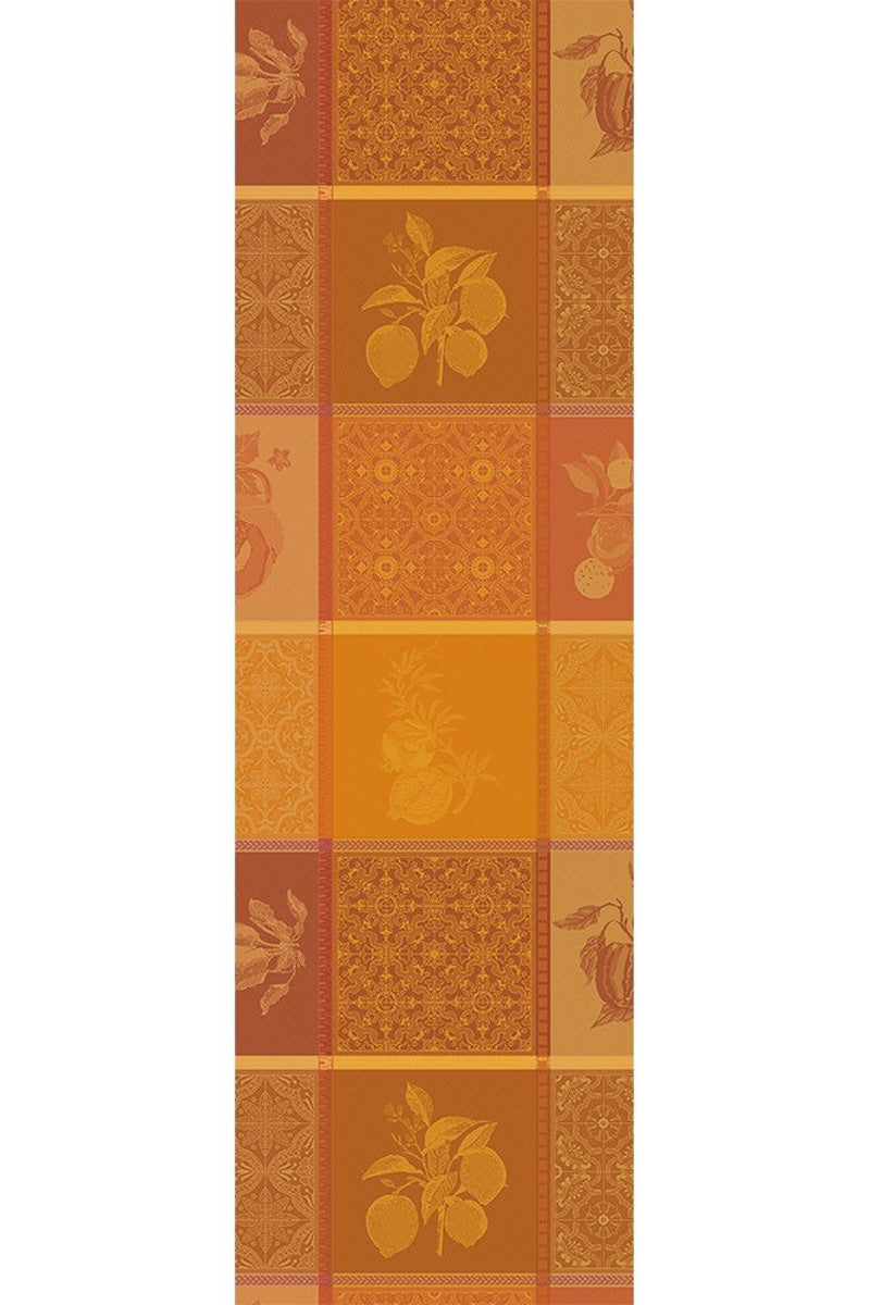 Unit price perTransform your kitchen into a harvest haven with the 100% cotton Mille Tutti Frutti Ocre Tablerunner, boasting a lively depiction of fruits, vegetables, and intricate floral designs in the radiant tones of autumn's golden orange palette. This woven design was crafted from original artwork, hand-drawn by our in-house team of textile artisans & designers in France. Constructed on jacquard looms with extra long staple cotton, Garnier Thiebaut USA's jacquard table linen collections are woven for longevity, and can last for generations with the proper washing maintenance and use. Elevate your dining experience with the Mille Tutti Frutti Ocre Tablerunner, a versatile and elegant addition to your table linen collection that effortlessly captures the essence of fall's radiant colors and bountiful harvest.
