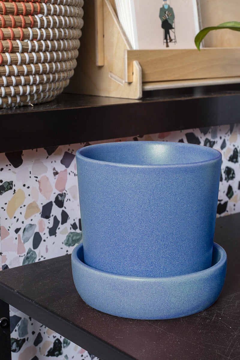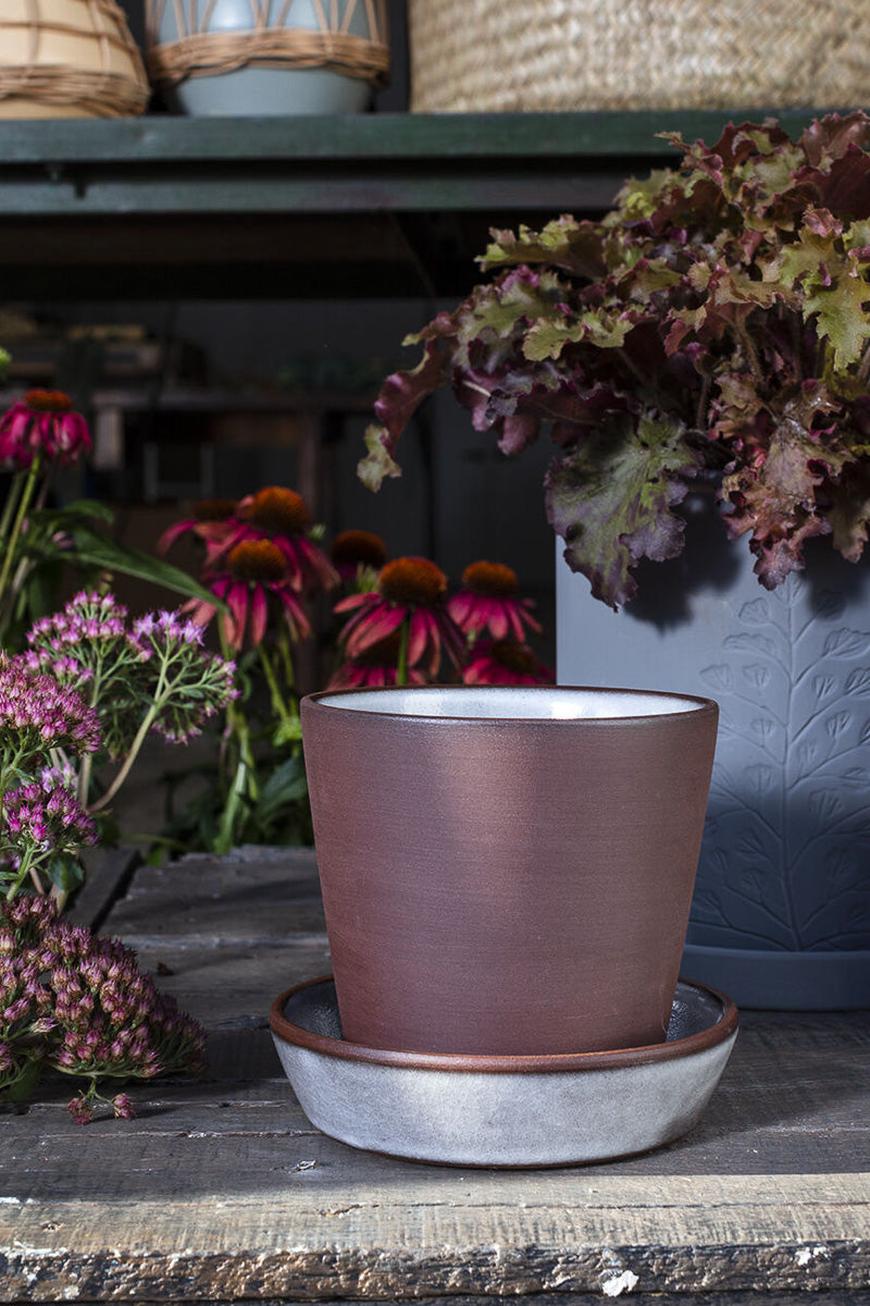Unit price perThe Cooper Pot offers simple lines and a unique reverse two-tone finish with dark terra-cotta and blue-gray glaze. It has a drainage hole and extra deep saucer to prevent overflow.