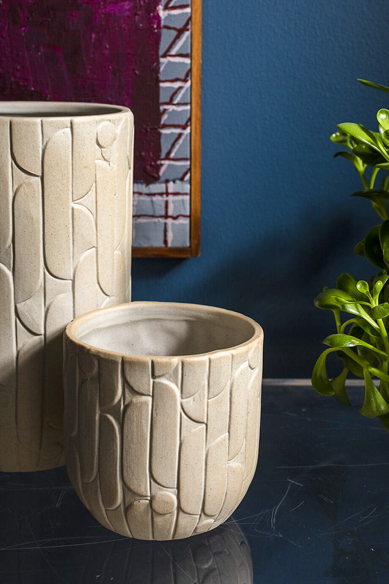 Unit price perThe Linden Pot is neutral, minimalist, and modern, with added interest from its tone-on-tone tan tick design pattern. Includes a drainage hole and saucer for ease of plant-care, as well as an elevated status on your shelf.