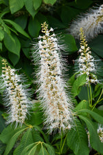 Bottlebrush Buckeye features showy spikes of white flowers with red anthers rising above the foliage in early summer. It has dark green deciduous foliage. The large palmate leaves turn yellow in fall.
