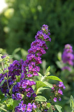 A valuable compact garden plant with spectacular dark purple-violet spikes of flowers in summer; attracts butterflies; may treat as a perennial and cut it back to the ground each spring as it regrows vigorously and blooms on new wood; seedless