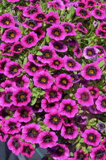 Superbells® Blackcurrent Punch™ Calibrachoa is clothed in stunning fuchsia trumpet-shaped flowers with yellow throats and black centers at the ends of the stems from late spring to mid fall. Its small pointy leaves remain green in color throughout the season.