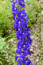 Bellamosum Belladonna Larkspur features bold spikes of royal blue flowers with white eyes rising above the foliage from early to late summer. The flowers are excellent for cutting. Its deeply cut lobed leaves remain dark green in color throughout the season.