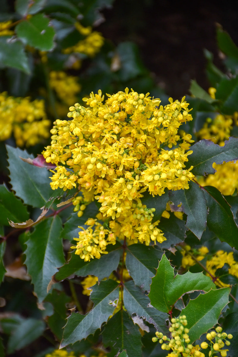 Compact Oregon Grapeholly is primarily grown for its highly ornamental fruit. It features an abundance of magnificent blue berries from mid summer to early fall. It features showy racemes of fragrant yellow flowers hanging below the branches in early spring. It has dark green evergreen foliage which emerges burgundy in spring. The spiny pinnately compound leaves turn an outstanding coppery-bronze in the fall, which persists throughout the winter.