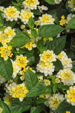 Lemon Glow Lantana features showy cymes of white flowers with yellow centers at the ends of the branches from early summer to mid fall. Its tomentose pointy leaves remain green in color throughout the year.