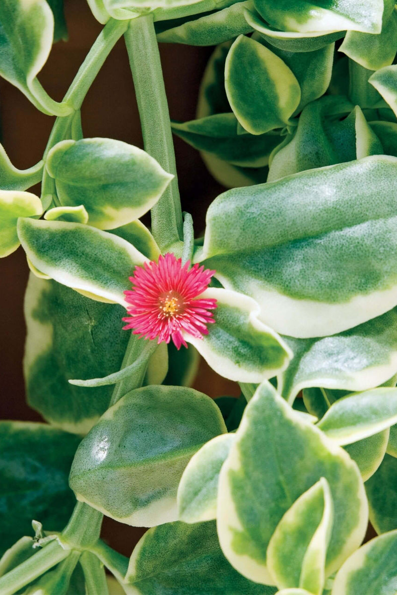 Mezoo™ Trailing Red Livingstone Daisy features dainty red daisy flowers with gold eyes at the ends of the stems from early summer to mid fall. Its attractive succulent heart-shaped leaves remain bluish-green in color with distinctive creamy white edges throughout the year.