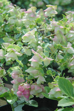 Kent Beauty Oregano has masses of beautiful nodding creamy white hop-like flowers with pink bracts at the ends of the stems from early summer to early fall, which are most effective when planted in groupings. The flowers are excellent for cutting. Its attractive small fragrant heart-shaped leaves remain bluish-green in color with distinctive silver veins throughout the year.