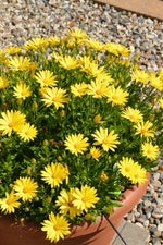Osticaâ„¢ Glamour Osteospermum features showy yellow daisy flowers with gold eyes at the ends of the stems from late spring to mid fall. The flowers are excellent for cutting. Its pointy leaves remain green in color throughout the season.
