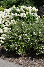 Happy Face® White Potentilla has white flowers with gold eyes at the ends of the branches from late spring to early fall. It has dark green deciduous foliage. The small ferny compound leaves do not develop any appreciable fall color.