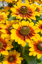 Toto ® Rustic Coneflower has masses of beautiful gold daisy flowers with dark brown eyes and a burgundy ring at the ends of the stems from early summer to late fall, which are most effective when planted in groupings. The flowers are excellent for cutting. Its serrated pointy leaves remain green in color throughout the season.