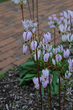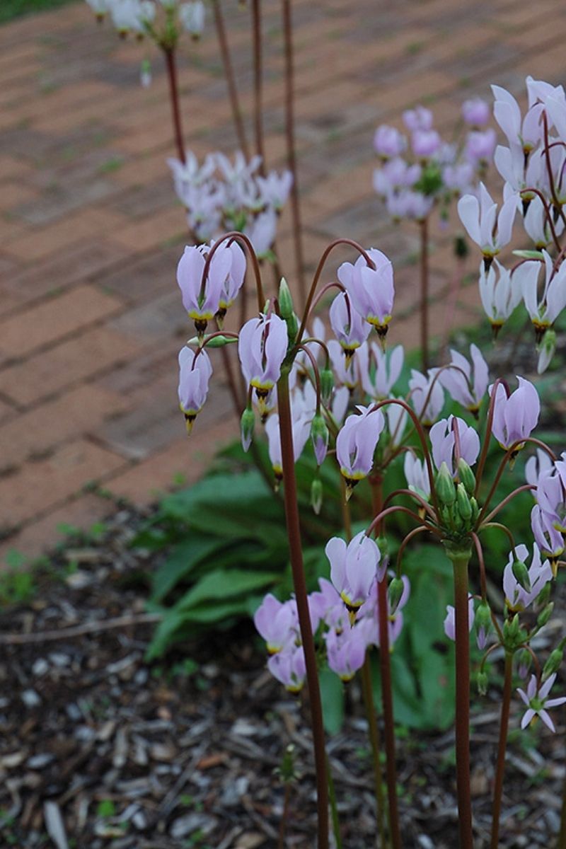 Shooting Star features dainty nodding pink recurved flowers with yellow eyes at the ends of the stems in mid spring. Its pointy leaves remain dark green in color throughout the season.
