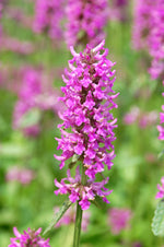June is a romantic time of year in the garden and this stachys adds to the drama with longer spikes of pinker-purple flowers. Very upright plants work nicely with Monarda 'Mojo'. Crinkled green foliage looks great all season and resists deer. Average to moist soil is best.