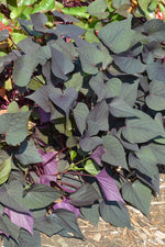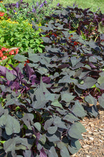 Black Heart Sweet Potato Vine is primarily valued in the garden for its spreading and trailing habit of growth. Its attractive heart-shaped leaves emerge grayish green in spring, turning dark gray in color with curious purple undersides throughout the season.