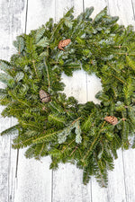 Indulge in the beauty of the holiday season with our fresh cut wreaths. Made from fresh greenery, this evergreen wreath exudes a rustic charm that will add a touch of nature to your home.