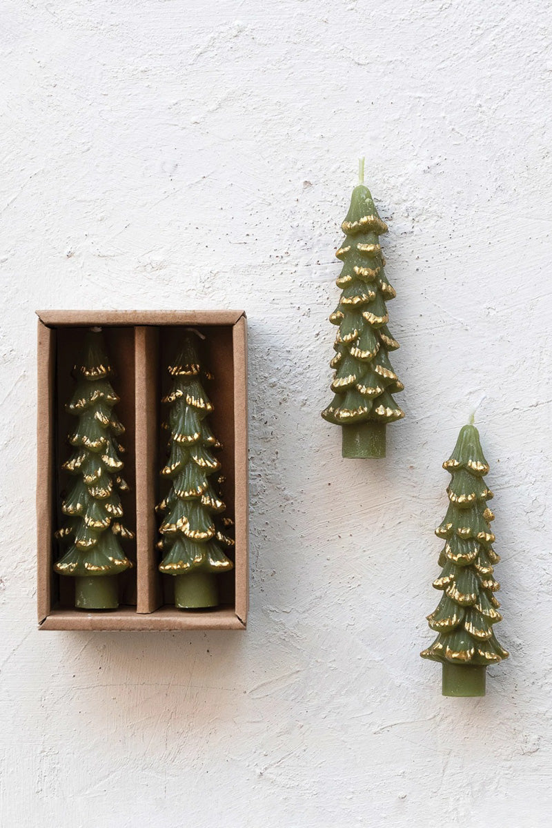 Tree Shaped Taper Candles With Gold Tips 4.75" Evergreen Set of 2