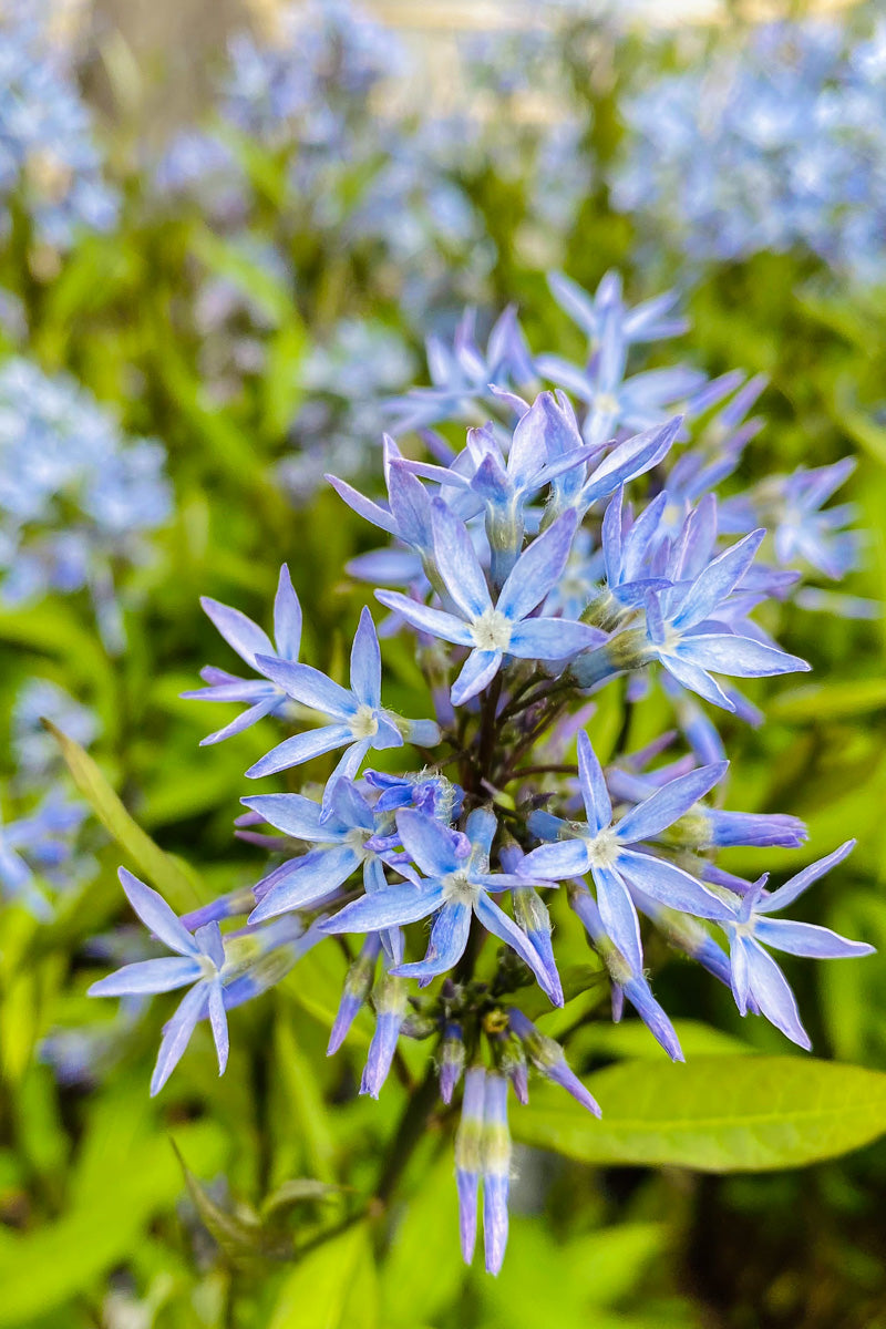 Incredibly dark stems emerge from the ground in spring, producing olive green leaves with silver veins; beautiful periwinkle blue, star-shaped flowers in springtime, on a wide, mounding, shrubby habit; does best in moist, well-drained soil