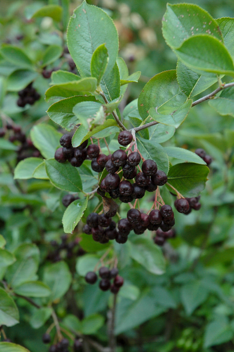 Black Chokeberry features showy panicles of white flowers with brick red anthers at the ends of the branches in mid spring. It has forest green deciduous foliage. The glossy oval leaves turn an outstanding red in the fall. It produces black berries from late summer to late winter.