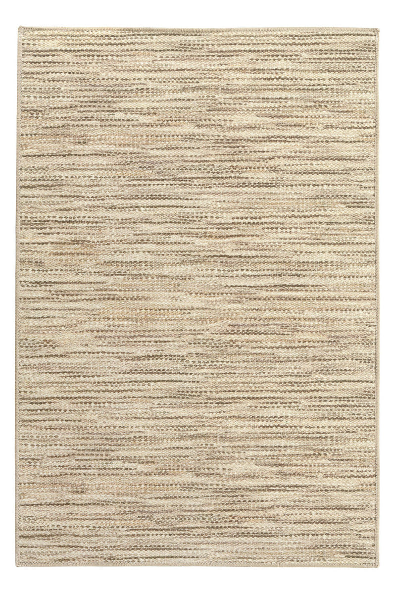 Unit price perA fresh and modern play on vertical and horizontal stripes, woven in strips and sewn together for a unique effect. In raw, natural heathered shades, this heftier flat woven rug's rich texture and muted tones derive from a blend of cozy wool, hardworking jute, and soft cotton. Finished along the sides with an alternating chunky felted wool and substantial natural twisted jute fringes.
