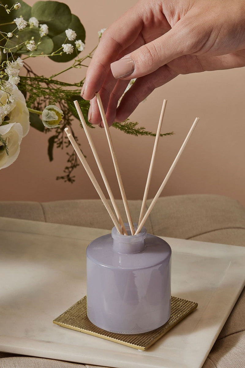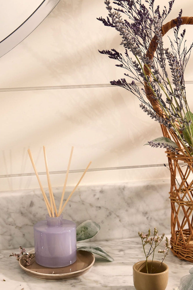 The Lavender Petite Reed diffuser offers a flameless way to fill your surroundings with the floral, soothing fragrances of lavender, rosewood, violet, and sage in a beautiful soft purple glass.
