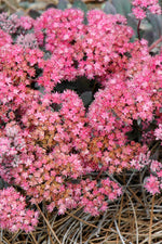 This newer variety of Groundcover Sedum will bedazzle you with its stunning flowers and foliage! Attractive, succulent gray-blue leaves are flushed purple and form a dense, spreading mound. In August huge (up to 9" diameter) flower clusters in a bright raspberry color completely cover the mat of foliage, remaining colorful for weeks. Superior as a small-scale groundcover, rock garden accent, edger or "filler" plant in sunny containers.