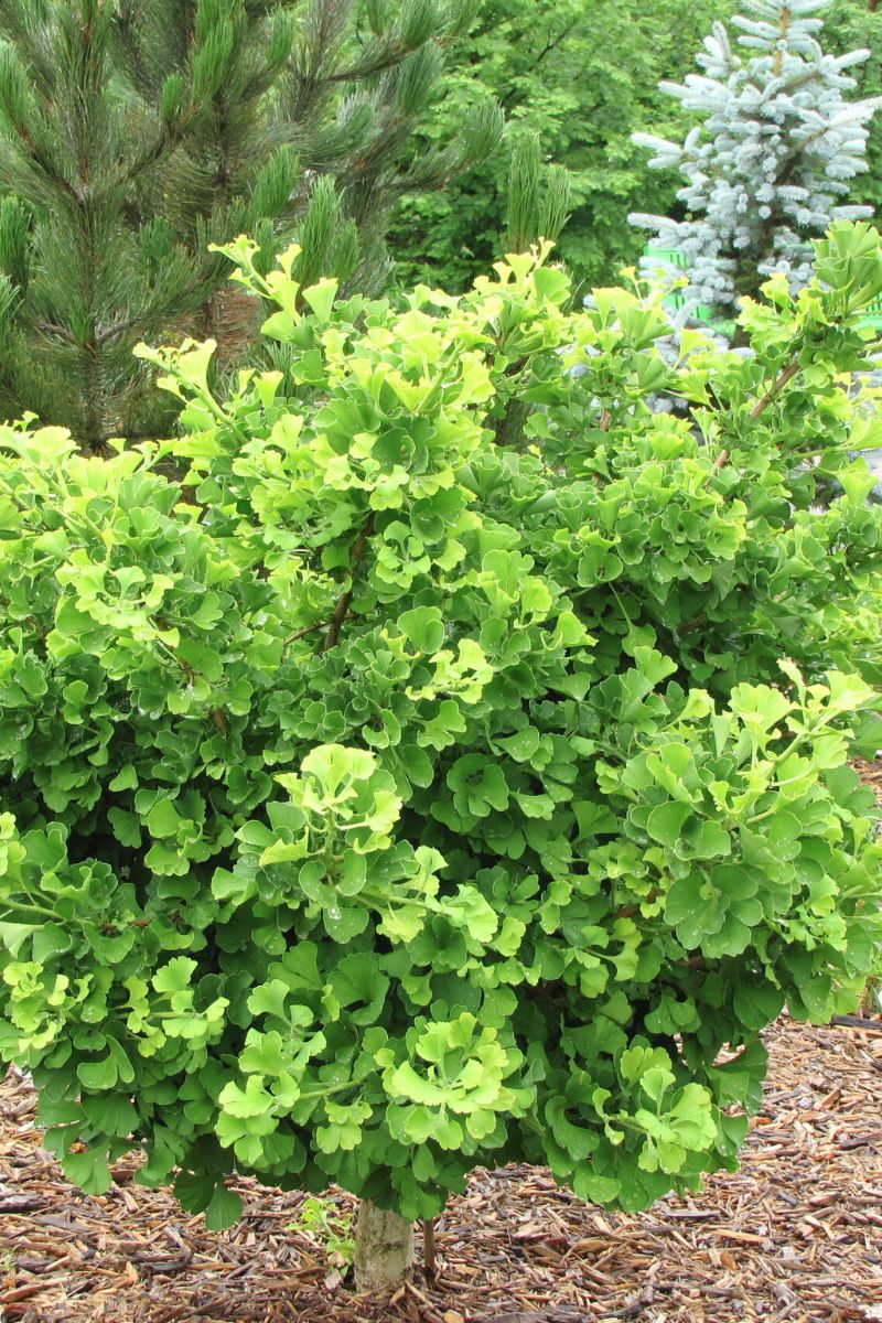 Mariken Dwarf Ginkgo is primarily valued in the garden for its ornamental globe-shaped form. It has bluish-green deciduous foliage which emerges chartreuse in spring. The fan-shaped leaves turn an outstanding buttery yellow in the fall.