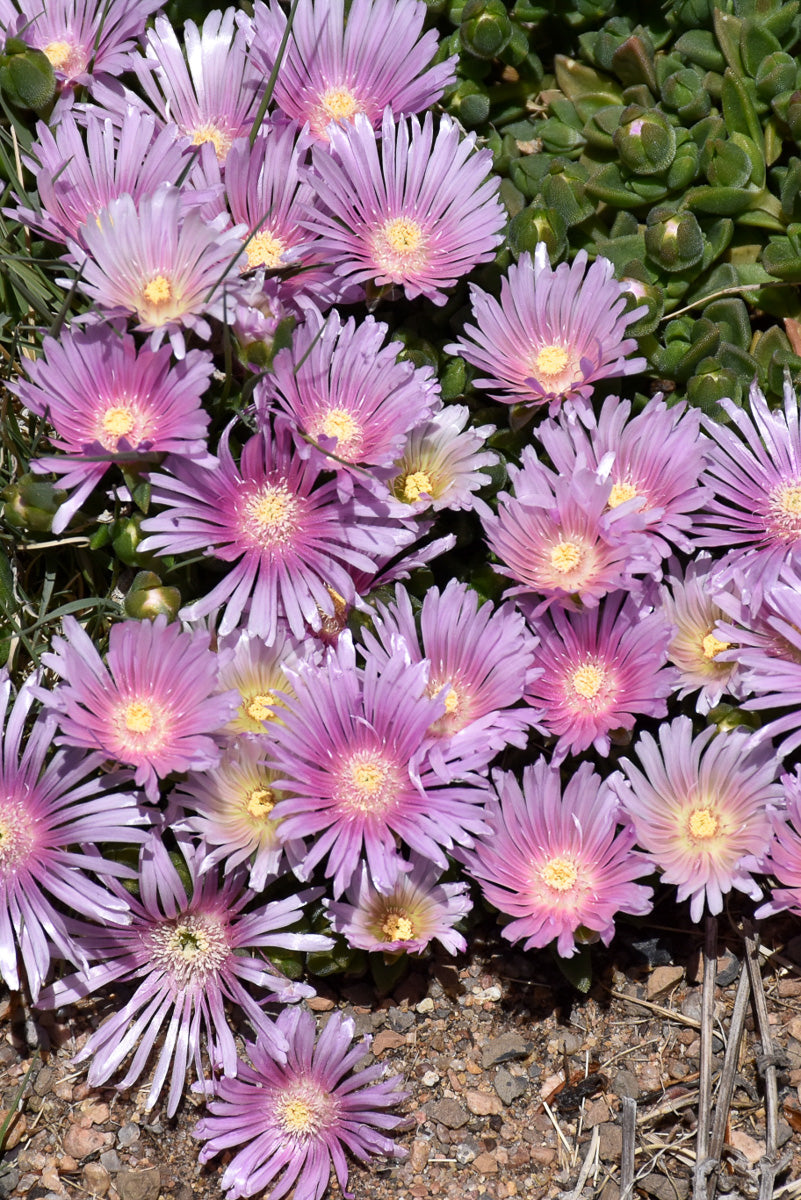 Lavender Ice Ice Plant features showy lavender daisy flowers with buttery yellow eyes and pink centers rising above the succulent-like foliage from late spring to early fall. Its attractive small succulent narrow leaves are dark green in color. As an added bonus, the foliage turns a gorgeous burgundy in the fall. This plant benefits from gravel mulch. Ideal in borders, mass plantings and containers. Deer resistant.