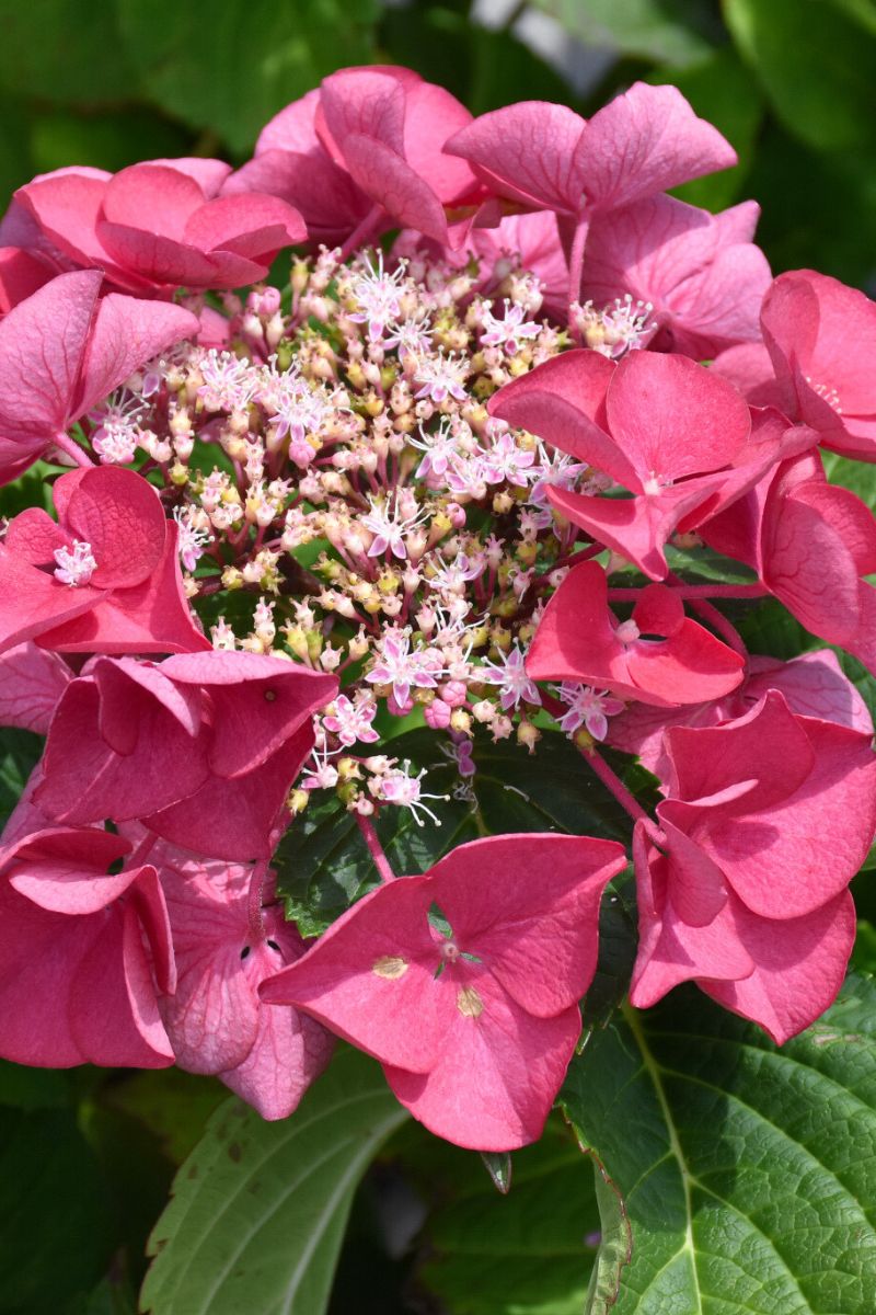 Cherry Explosion™ Hydrangea features bold cherry red lacecap flowers with shell pink centers at the ends of the branches from mid spring to mid fall. The flowers are excellent for cutting. It has dark green deciduous foliage. The glossy pointy leaves turn burgundy in fall.