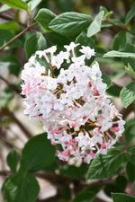 Judd Viburnum features showy clusters of fragrant white flowers at the ends of the branches in early spring, which emerge from distinctive pink flower buds before the leaves. The black fruits are held in abundance in spectacular clusters from late summer to late winter. It has dark green deciduous foliage. The round leaves turn an outstanding deep purple in the fall.
