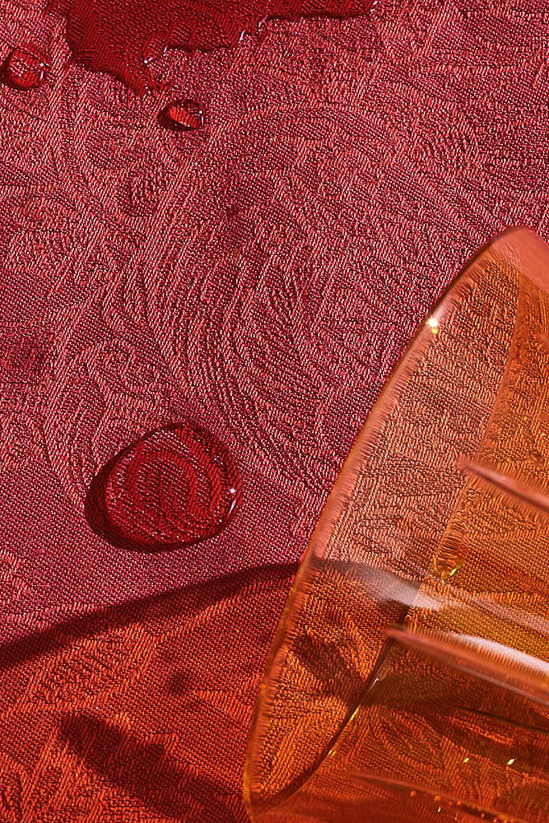 The Alexandria Ruby Tablecloth is woven in France from 100% extra-long staple cotton and finished with Green Sweet stain-resistant treatment that preserves the fabric's natural softness while helping to guard against spills. Inspired by the elegance of a French chateau, its ruby red jacquard design is framed with a refined border in gold and white, where each thread is carefully blended to create depth and richness. A timeless piece that highlights the artistry of French weaving, it brings classic luxury to any table.