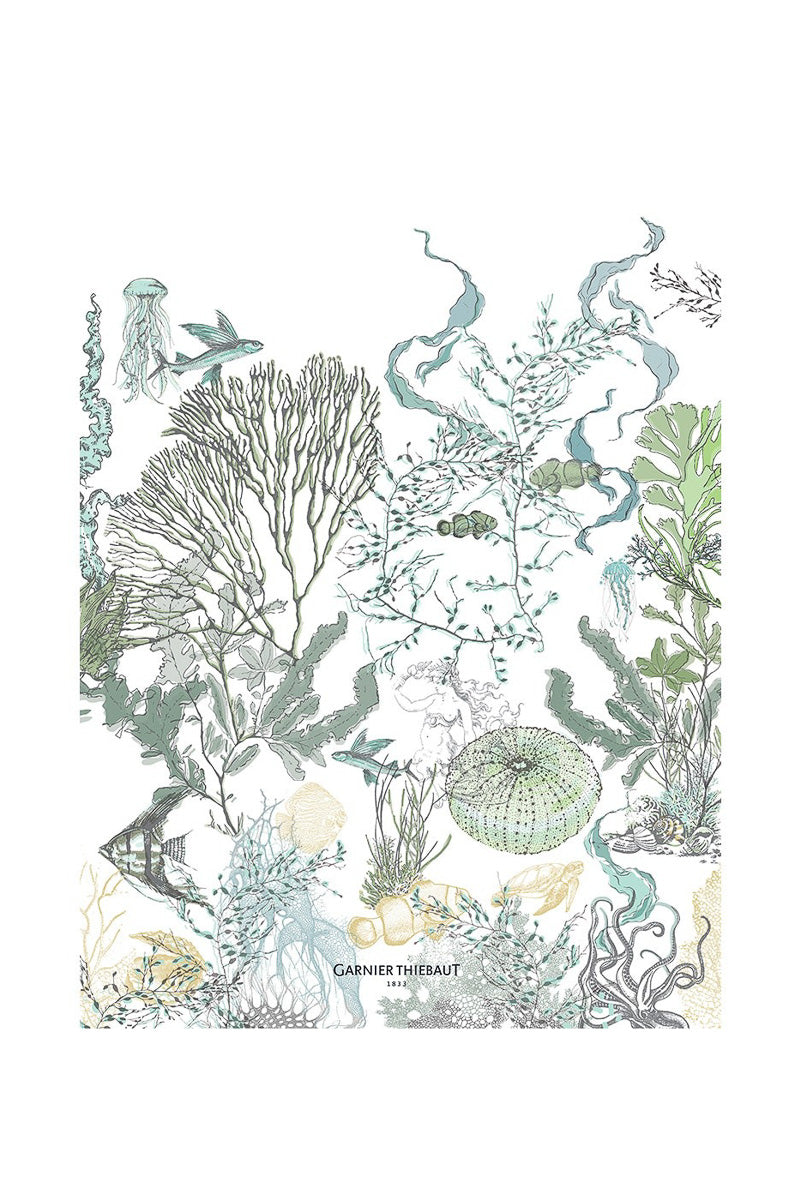 Unit price perThe Balade Marine Verde Kitchen Towel by Garnier Thiebaut features printed underwater imagery with floating fish, coral, and jellyfish in green, Grey, blue, and gold. Woven from a cotton-linen blend (50% linen, 50% cotton), this design is based on original artwork hand-drawn by our in-house artisans, offering lasting durability and an effortless, elegant look.