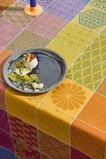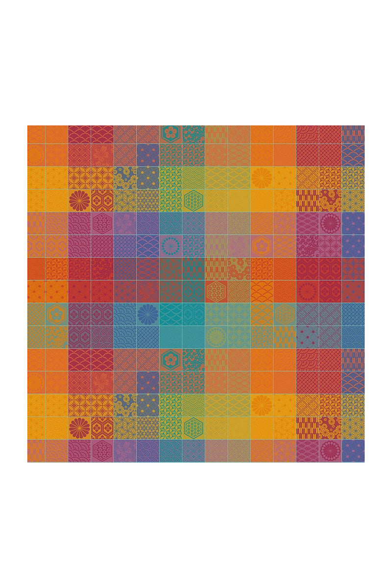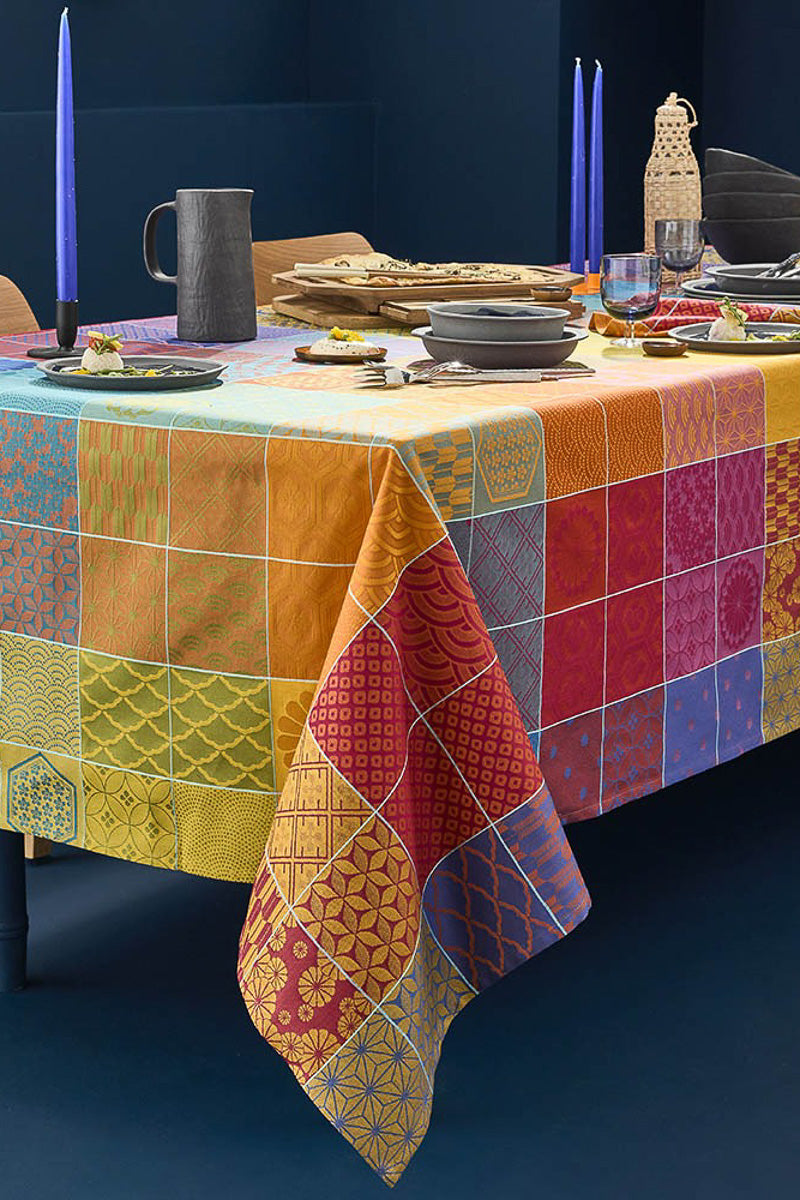 Unit price perThe Mille Hana Floralies Tablecloth is woven in France from 100% extra-long staple cotton, featuring a richly detailed jacquard weave that offers a soft, elegant finish. Its multicolored floral tile pattern in in colors such as orange, red, blue, and purple is expertly crafted, with each thread layered to create depth, harmony, and visual movement. A celebration of color and craftsmanship, this design brings refined artistry to the table.