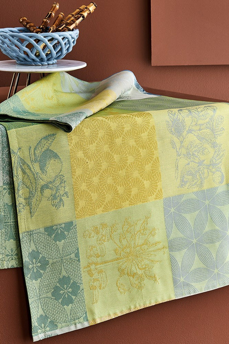 Unit price perDiscover the green, yellow, and blue patchwork design of the Mille Parfums Limoni Tablerunner with flowers, fruit, and geometric motifs. This woven design was crafted from original artwork, hand-drawn by our in-house team of textile artisans & designers in France. Constructed on jacquard looms with extra long staple cotton, Garnier Thiebaut USA's jacquard table linen collections are woven for longevity, and can last for generations with the proper washing maintenance and use.