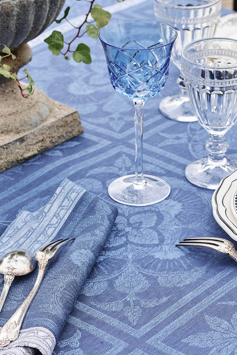 Inspired by traditional French Chateau living, this 100% linen tablecloth in blue and white features mitered corners and is woven with a beautiful jacquard weave.