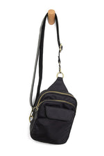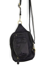 When you want to travel light and handsfree, this compact sling is perfect for your next trip or daily adventure. This lightweight crossbody is made in water resistant nylon, trimmed with our signature vegan leather and is packed with organizational features including a key ring on a tether, built in credit card pockets, a zip compartment to stash your phone, and an innovative pull-out water bottle pocket to carry your 30 oz. reusable bottle to stay hydrated on the go.