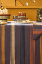 Unit price perThe Mille Bambous Onyx Tablecloth is woven in France from 100% extra-long staple cotton, offering a smooth, luxurious finish with exceptional durability. Its intricate jacquard weave features softly blended stripes of black, orange, pink, and yellow set against deep purple, showcasing the refined artistry of color layering and textile craftsmanship. A striking yet harmonious design, this piece brings contemporary style to the dining table.