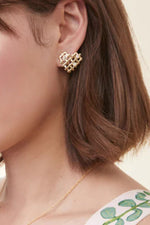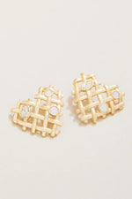 The Woven Heart Earrings feature a woven pattern of 18kt matte gold plating in the shape of a heart with crystal accents. Subtle charm shines through this must-have accessory.