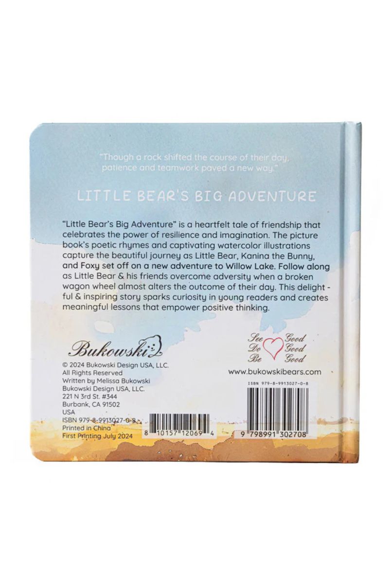 Unit price per"Little Bear's Big Adventure" is a heartfelt tale of friendship that celebrates the power of resilience and imagination. The picture book's poetic rhymes and captivating watercolor illustrations capture the beautiful journey as Little Bear, Kanina the Bunny, and Foxy set off on a new adventure to Willow Lake. Follow along as Little Bear & his friends overcome adversity when a broken wagon wheel almost alters the outcome of their day. This delightful & inspiring story sparks curiosity in young readers and creates meaningful lessons that empower positive thinking.