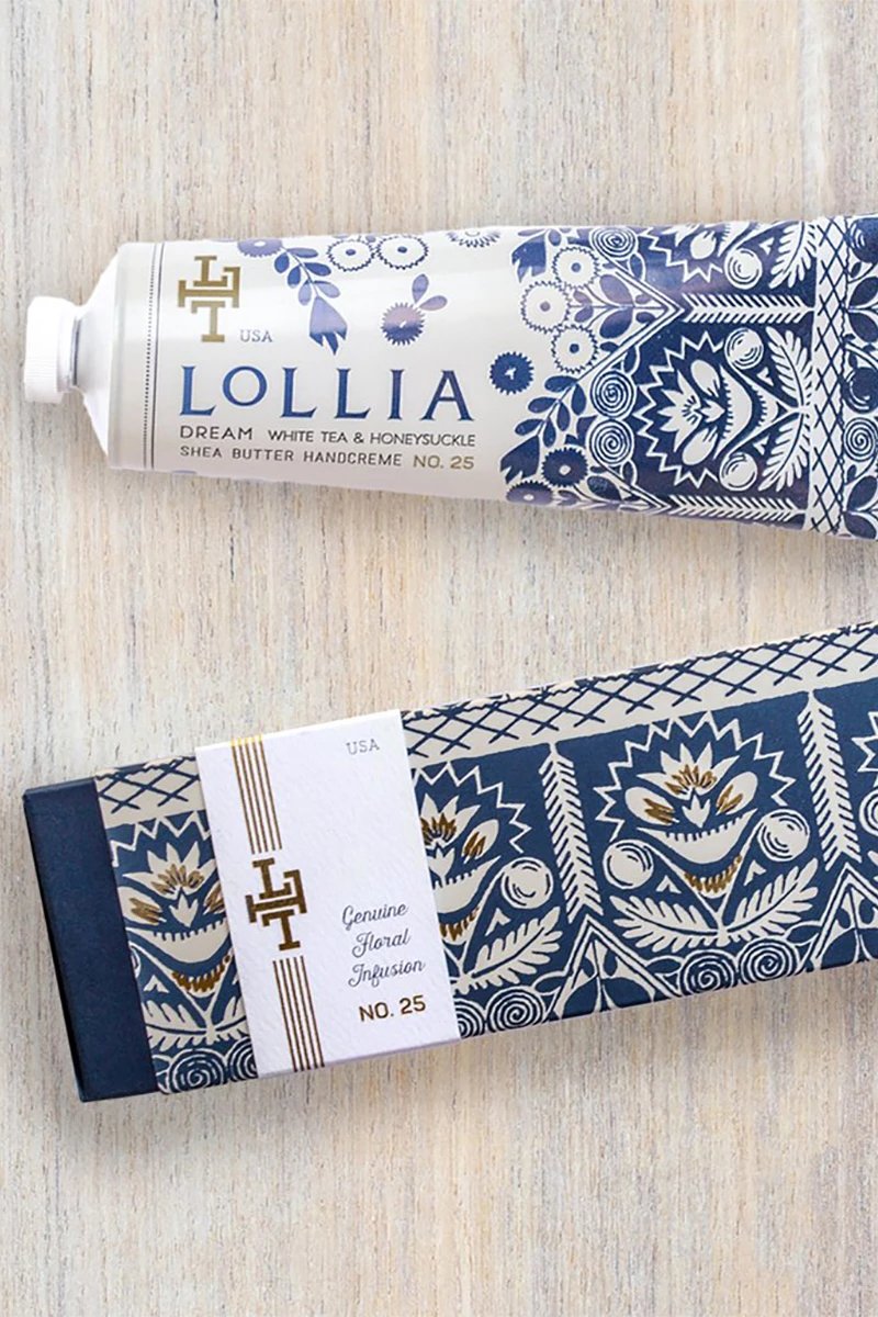 Nestled in a beautiful gold-kissed box, each miniature handcreme showcases an iconic Lollia pattern.