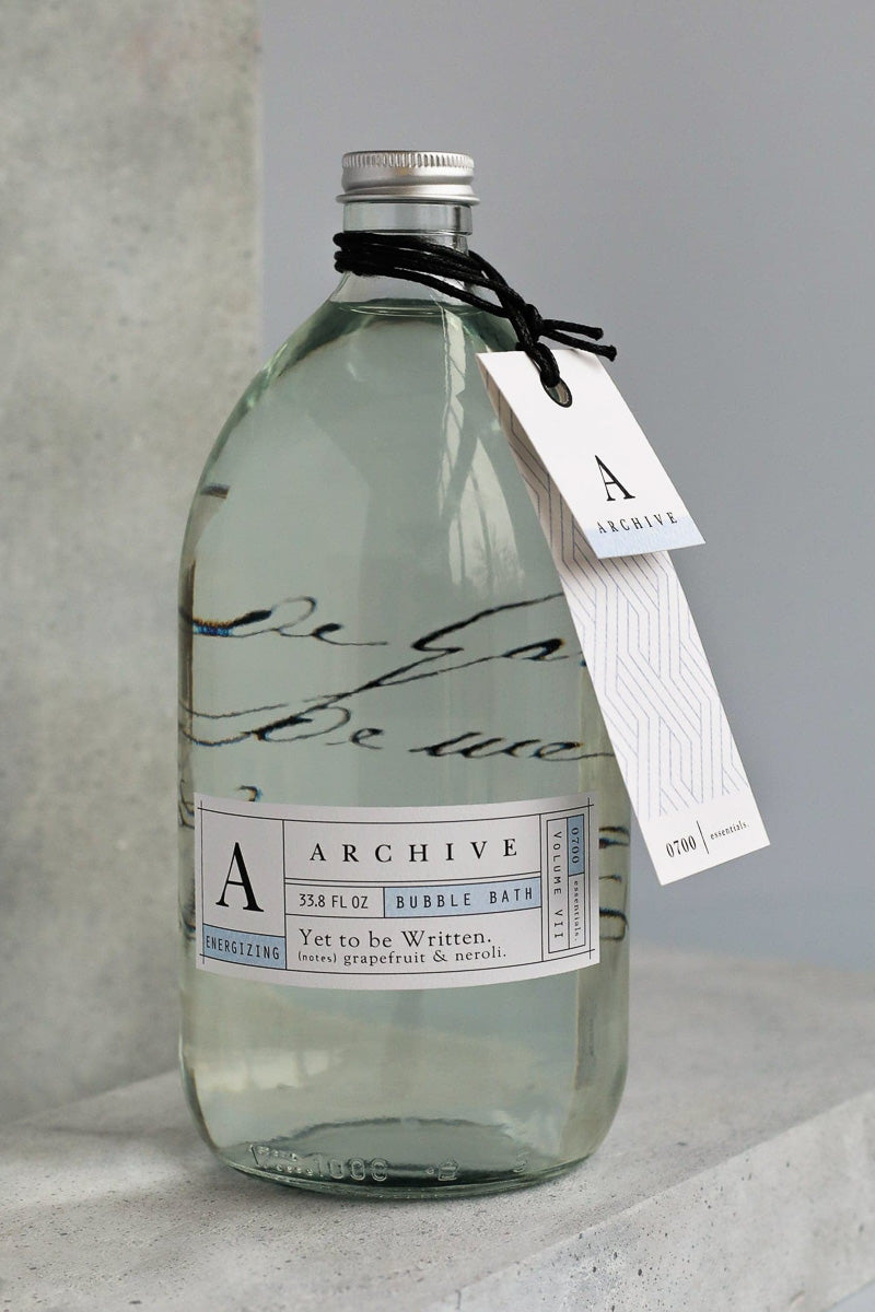 Gaze into this classic bottle for a glimpse into the past: its transparent glass reveals handwritten passages from antique books. Sophisticated and timeless, this keepsake piece—topped with a hand-tied waxed cord and an aluminum cap—makes a statement long after the last luxurious soak.