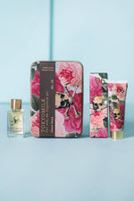 Design details: An iconic skull & crossbones set off by captivating blossoms adorn this tin box, opening to reveal an artful interior and enticing duo of treasures: the Little Luxe Eau de Parfum and Petite Treat Handcreme.