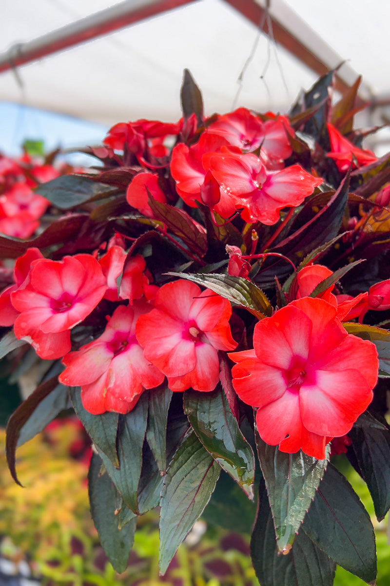 New Guinea Impatiens features bold round flowers at the ends of the stems from mid spring to early fall. Its pointy leaves remain dark green in color throughout the season.