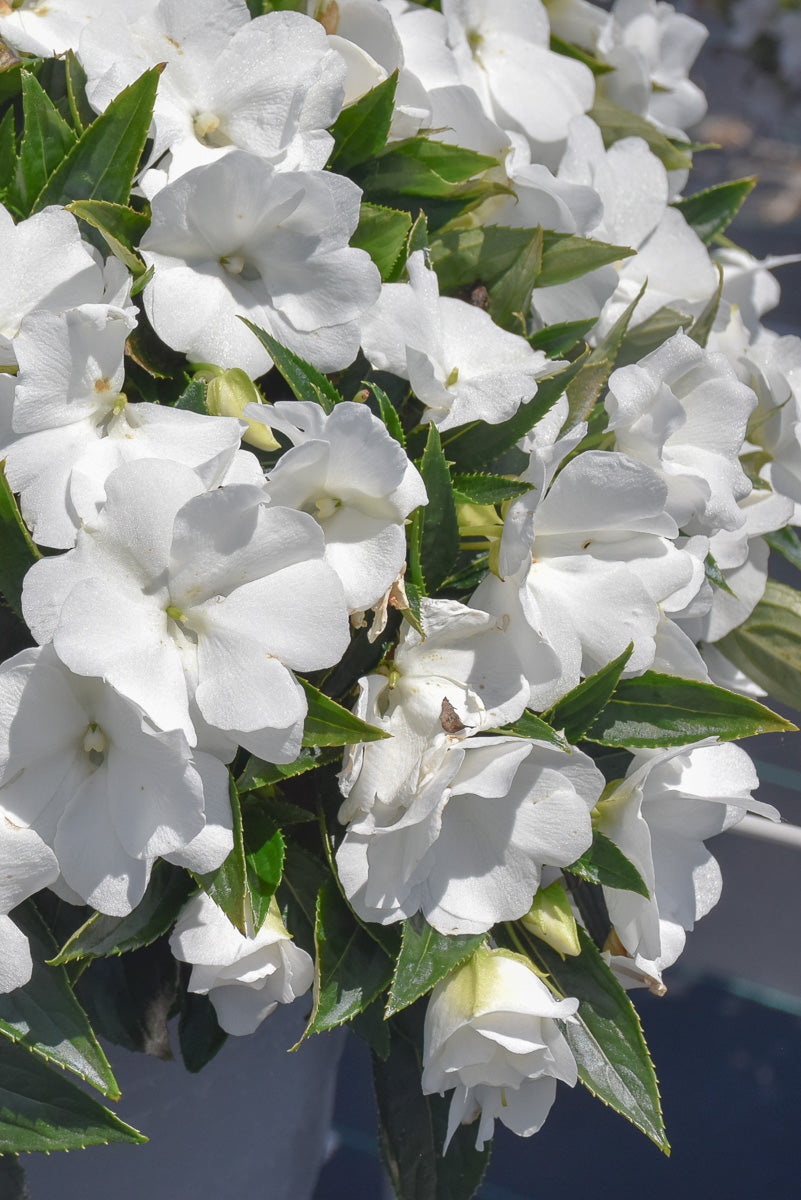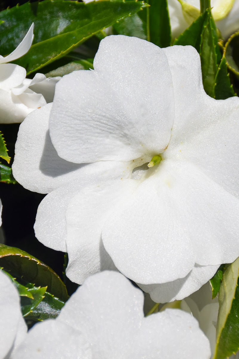 Super Sonic® White New Guinea Impatiens features bold white round flowers at the ends of the stems from mid spring to early fall. Its pointy leaves remain dark green in color throughout the season.