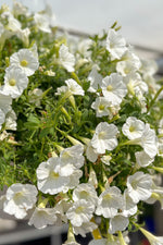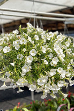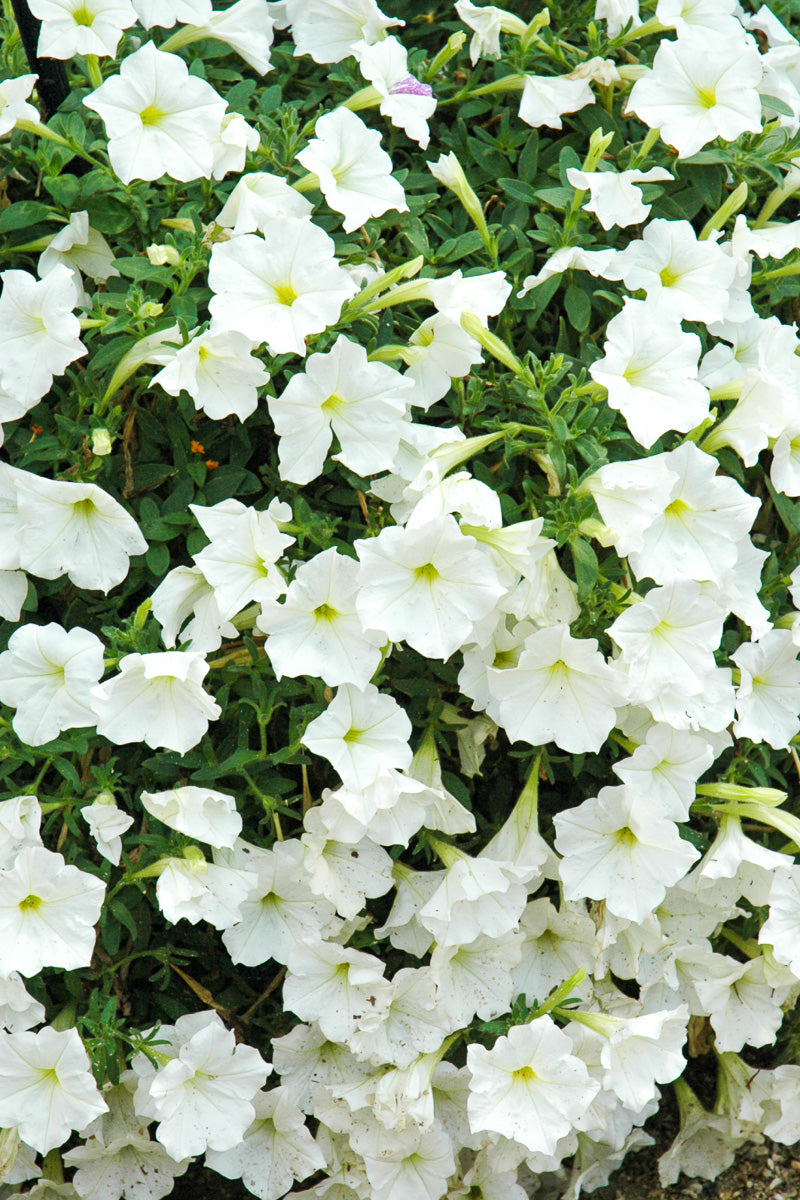 Supertunia ® White Petunia is clothed in stunning white trumpet-shaped flowers at the ends of the stems from mid spring to mid fall. Its pointy leaves remain green in color throughout the season.