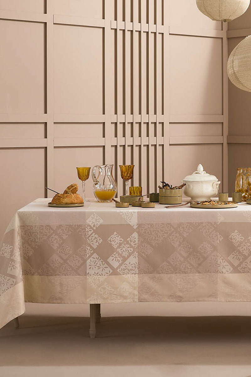 Unit price perThe Mille Pistils Naturel Tablecloth in 61"x61" is woven in France from 100% extra-long staple cotton, offering a smooth jacquard weave with a subtle, elegant texture. Its contemporary pattern in layered neutral tones is skillfully created through the careful blending of threads, highlighting the artistry of French textile design. Sophisticated and versatile, it brings understated beauty to modern dining spaces.