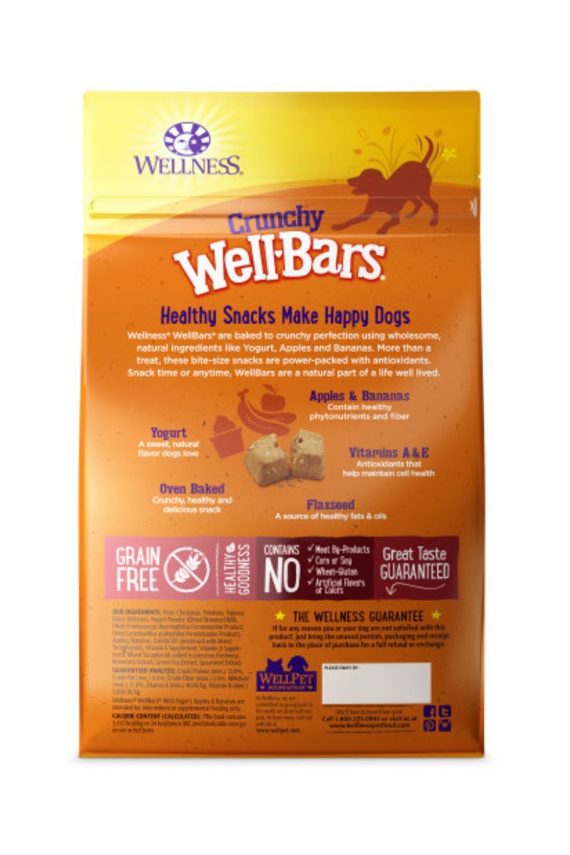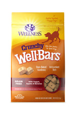 Wellness® WellBars Natural Dog Treats are grain free, all natural, crunchy dog treats. WellBars are oven-baked using only premium ingredients with no corn, soy, wheat, artificial colors or flavors.