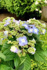 Lacy deep-pink centers are surrounded by gorgeous blossoms of pink or periwinkle blue, depending on soil type, blooms on both old and new wood all summer long; sturdy red stems, glossy deep green leaves turn red in fall to offer year-round interest.