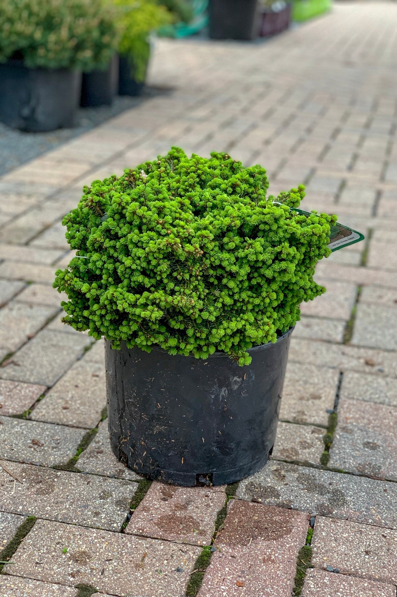 Dense nugget of evergreen foliage is a perfect accent in rock gardens, patio or foundation plantings. A hardy dwarf Norway Spruce with short, dark green needles grows slowly into a cushion-shaped mound. Sturdy branches hold up well to snow loads and isn't bothered by road salt. Adaptable to many different conditions including cold, heat and drought once established.