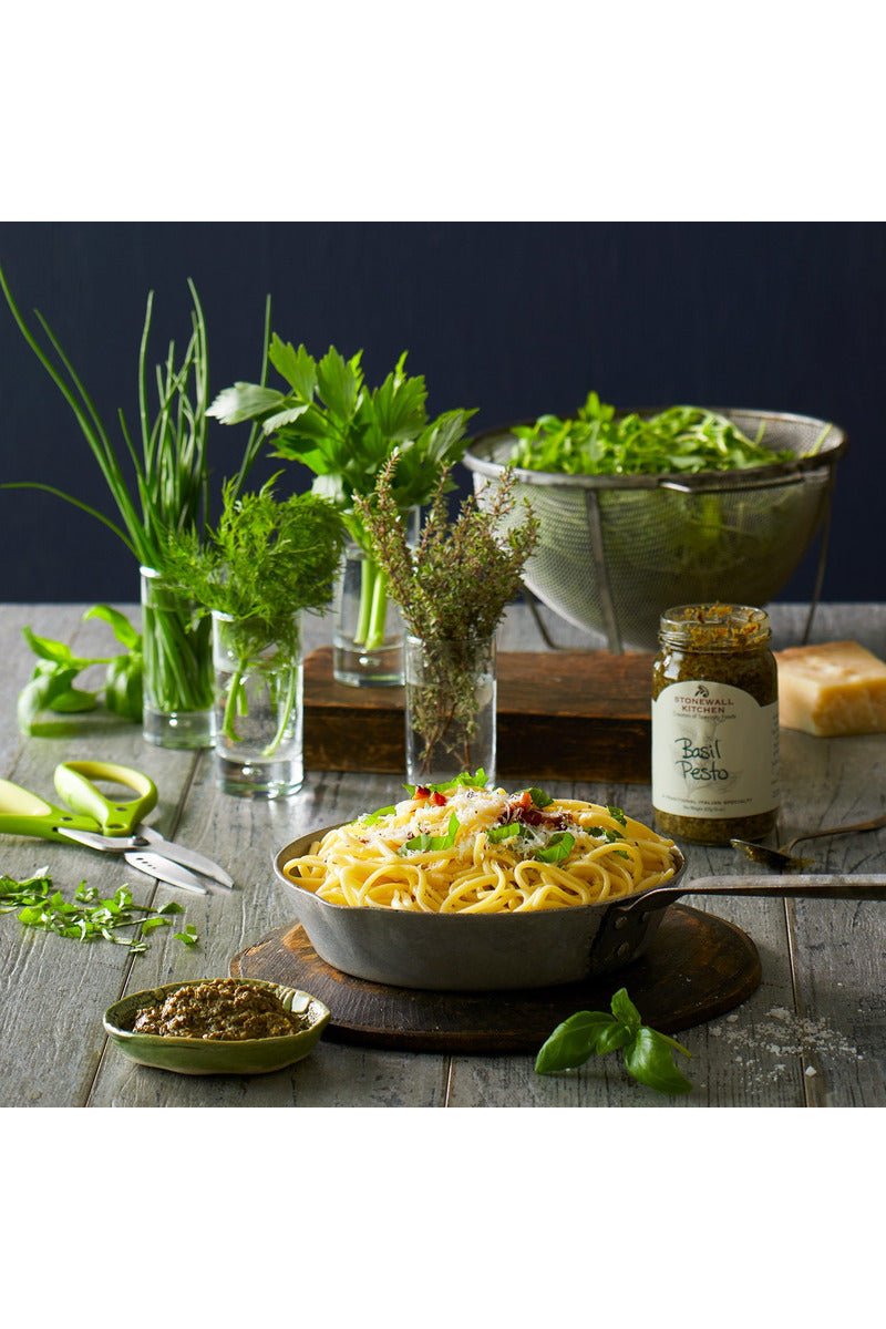 Unit price perThis was created for those of you who love the traditional, summery taste of basil pesto, but just don't have the time or inclination to grow your own basil. Stonewall Kitchen Basil Pesto also comes in handy when you need a quick meal or appetizer for welcoming unexpected dinner guests. Made from the finest and freshest basil, oils, parmesan cheese, walnuts, pine nuts and not much else.